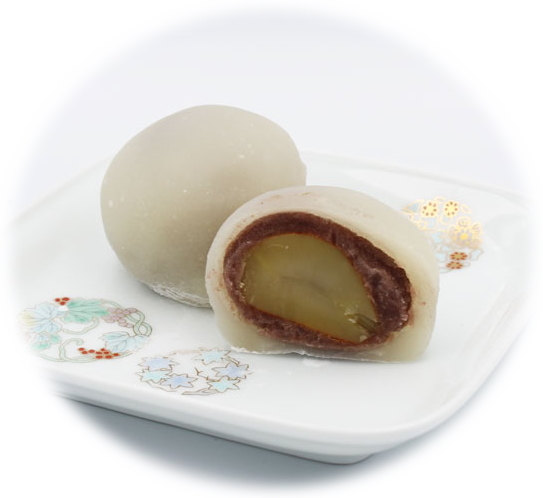 栗まるごと1粒とシナモン風味のあんが入った求肥餅です。